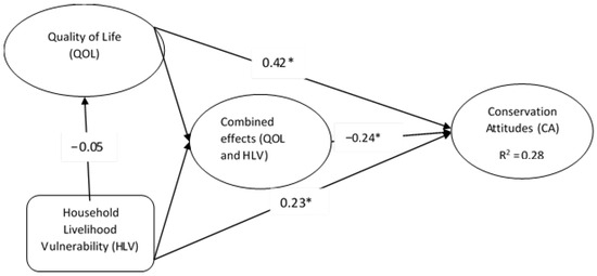 Path diagram for a structural model of the relationship between livelihood vulnerability, subjective quality of life, and conservation attitudes. Note: * indicates significance at 0.05 alpha. The model without moderation effects had an R2 of 0.19 (19%).
