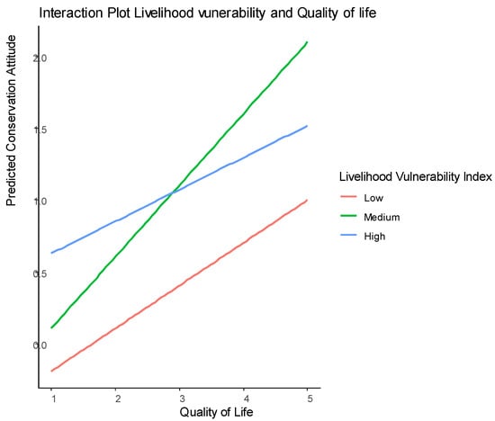 The relationship between the conservation attitudes, quality of life, and livelihood vulnerability was assessed. A direct relationship between the livelihood vulnerability index and conservation attitude was established. Similarly, the effects of the relationship between the quality of life and conservation attitudes were assessed statistically. Also, the path predicting the effect of livelihood vulnerability on the quality of life was fitted. Furthermore, the interactions between the quality of life and livelihood vulnerability in influencing conservation attitudes were modeled. Figure 4 depicts the regression coefficient and estimated t-values for the direct and moderated effects model. The model explained variance in conservation attitudes (R2 = 0.28), indicating that the model’s predictive relevance is good. Statistically significant results supported H1, H2, and H4 (Figure 4). In contrast to our expectations, we found that the livelihood vulnerability positively influences the conservation attitude (β = 0.23, p = 0.001). A positive relationship between livelihood vulnerability and a positive conservation attitude might indicate that poor people are overly dependent on resources from national parks and that natural resources are like their life insurance. This observation might indicate that households depend on natural resources; thus, their existence is vital for daily living, contrary to the assumption that reducing poverty motivates biodiversity conservation. Increased vulnerability motivates them to support conservation efforts to secure the sustainability of these resources. The same stands for the quality of life (β = 0.42, p = 0.001). We did not find support for H3 in this study. Therefore, the livelihood vulnerability could not significantly influence the quality of life (β = 0.04, p = 0.418). An individual could probably be vulnerable but report a better general subjective quality of life. As predicted, the household vulnerability negatively moderated the effects of quality of life on conservation attitudes (β = −0.24, p = 0.001). This means that household vulnerability weakens the positive relations between quality of life and conservation attitudes. For medium vulnerability, the impact of quality of life on conservation attitudes is more robust compared to high and low vulnerabilities (Figure 5). In other words, if we improve the quality of life, the conservation attitude will increase positively when people are not vulnerable. At higher levels of livelihood vulnerabilities, the positive influence of quality of life on conservation attitudes decreases (Figure 5).