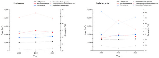 Between 2000 and 2020, the production functions maintained a high level and continued to rise. The area of hot spots experienced a slight decrease and then a significant increase, from 16,603.45 km2 to 16,374.73 km2, and then increased to 17,655.43 km2, and its proportion was greater than 30% throughout the entire study period. Moreover, the area of cold spots also exhibited a slow growth trend, increasing from 10,397.05 km2 to 11,392.98 km2.