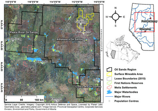 - Alberta Ministry of Energy. Alberta’s Leased Oil Sands Area Map—September 2017. 2017. Available online: https://open.alberta.ca/publications/alberta-s-leased-oil-sands-area-map (accessed on 10 November 2020).