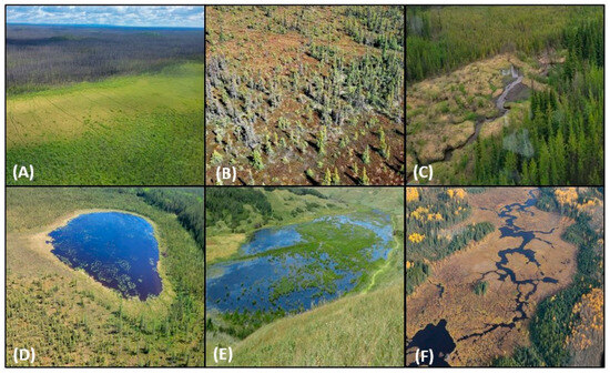 Examples of each wetland class present in the Oil Sands Region: (A) fen; (B) bog; (C) swamp; (D) shallow open water; (E) marsh; and (F) wetland complex featuring multiple wetland classes.