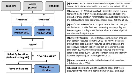 Workflow for combining three primary products (HFI 2010 and 2018, and AMWI) to create a wetland disturbance product from human footprint change between 2010 and 2018. GIS processes (completed in ESRI ARCGIS) are italicised. Grey boxes indicate primary data products, white indicates geospatial processes in ArcGIS, and blue indicates outputs.