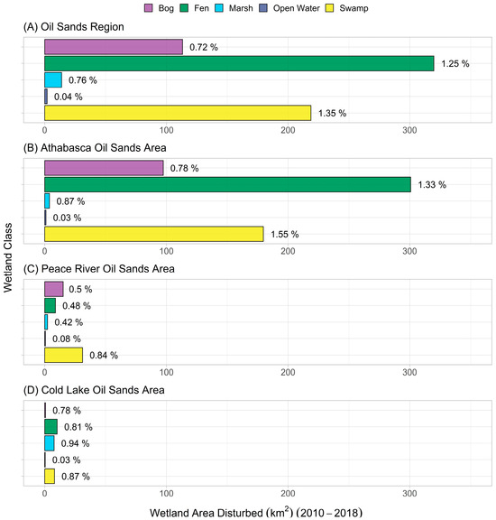 This study indicates that wetlands have suffered significant areal changes within the oil sands region of Alberta, Canada. Approximately four times as much wetland area was disturbed between 2000 and 2010 compared to 2010 and 2018. Examination of the OSR administrative areas indicated that the large Athabasca Oil Sands Area (AOSA) was a driver in the wetland areal disturbance in the region. A large proportion of disturbances in the AOSA are a result of the OSR’s only surface minable area, where large open-pit mining is permitted. The smaller Peace River and Cold Lake Oil Sands Areas also indicate disturbance of wetland areas but to lesser magnitudes than the AOSA. Peatlands (bogs and fens) suffer the greatest areal disturbances across the OSR and all its administrative areas, except for the Cold Lake Oil Sands Area where marsh disturbance is more prevalent due to increased presence on this parkland fragmented landscape. Sector analysis indicated that wetland disturbances resulting from human development across the OSR, and its administrative areas are primarily attributed to the oil and gas sector followed by forestry. In all areas, oil and gas dominates disturbance attribution except the Peace River Oil Sands Area where forestry rivals oil and gas activities. It is acknowledged that natural factors such as wildfires and indirect anthropogenic disturbances (e.g., hydrological disturbances) also contribute to wetland disturbance.