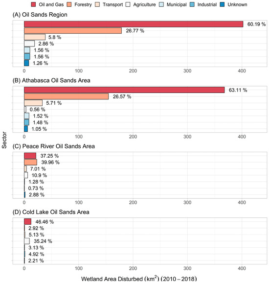 Wetland disturbed area change by major sector type between 2010 and 2018 from human footprint. Areal disturbance is reported in km2 with percentage of total disturbance attributable to each sector within each region/area noted adjacent to each bar.