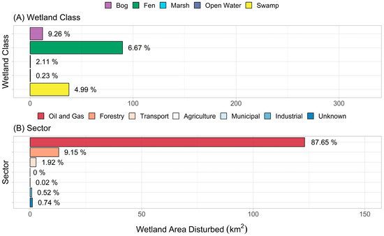 (A) Summary of proportional disturbance of wetlands in the Surface Mineable Area (SMA) based on wetland class between 2010 to 2018, and (B) wetland disturbance attributed to industrial sector.