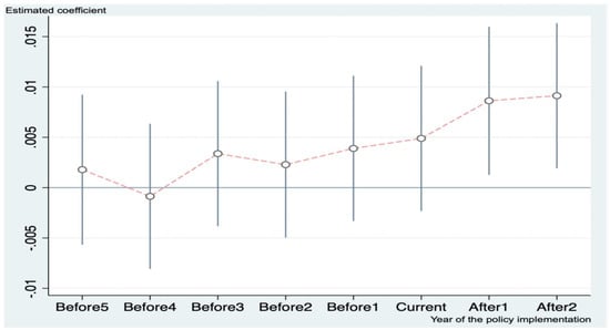 The parallel trend assumption is a necessary precondition for the use of DID in empirical papers [,]. This requires that the target variables of the two groups of samples tested prior to 2016 must conform to parallel trends. So, the effects of the policy can be explored. If this requirement is not met, the conclusions drawn by DID are not pure effects of the policy. We show the dynamic parallel trend graph below. Figure 2 clearly illustrates that the parallel trends change around 2016. Before 2016, the estimated coefficients are insignificant and fluctuate around 0. After 2016, the estimated coefficients are significant, which well satisfies the DID hypothesis.