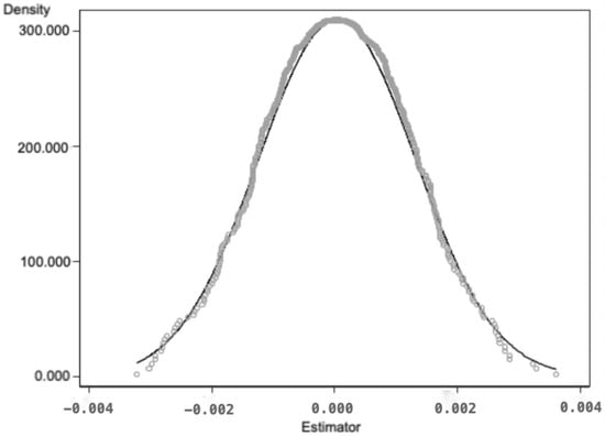 In complex economies, it is also likely that changes in the trends of the experimental and control groups are influenced by other policy or random factors. Placebo tests can help us make the results of the DID more robust []. This is carried out as follows: The treatment of the non-parametric replacement test is used to randomly sample all prefecture-level cities and policy times without duplication. We randomly selected the pilot cities of national key ecological function zones, as well the time of policy implementation. Regression was performed according to the DID regression formula and the probability of the regression coefficients of this spurious experiment was able to judge the reliability of the conclusions. This randomization experiment was then repeated 500 times. This was carried out to increase the persuasiveness of the placebo test. Finally, we plotted the density distribution based on the estimated DID coefficients from the 500 experiments, as in Figure 3. The figure shows that the estimated coefficients are distributed around 0 and have a normal distribution. This suggests that the original model did not miss important influences and the policy effect results are positive. Overall, the core findings are robust.