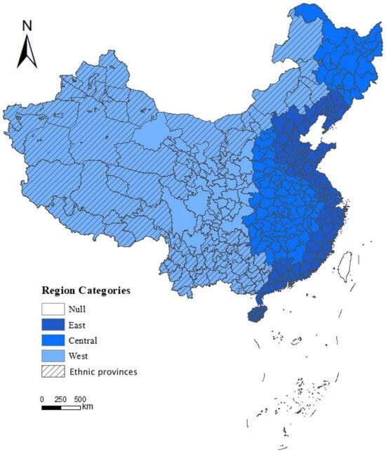 According to the existing literature, China’s eastern, central and western regions have significant differences in terms of their economic development level, industrial structure and resource endowment [,]. These differences may affect how well policies are implemented in different regions. Also, there are obvious differences between ethnic provinces and non-ethnic provinces in the economic structure, resource utilization, social culture and so on [,,]. For example, the industry of the ethnic provinces is dominated by the primary mining and processing of resources, the proportion of high-tech industries is relatively low and the industrialization level is significantly lower than the national average []. These particularities mean that the ethnic provinces may face more challenges and opportunities when dealing with the NKEFA policy. Therefore, it is necessary to analyze the regional heterogeneity of different economic conditions when studying the policy’s effect. This will help policy makers more accurately understand the actual situation and needs of different regions, so as to formulate policy measures that are more in line with regional characteristics. This can improve the pertinence and effectiveness of policies and reduce resistance in the process of policy implementation.