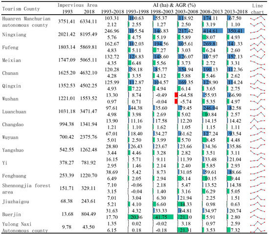Annual increase (AI) area and annual growth rate (AGR) for each county among five periods from 1993 to 2018. Blue blocks showed AI growth, green blocks showed AGR growth, and red blocks indicated decreases.