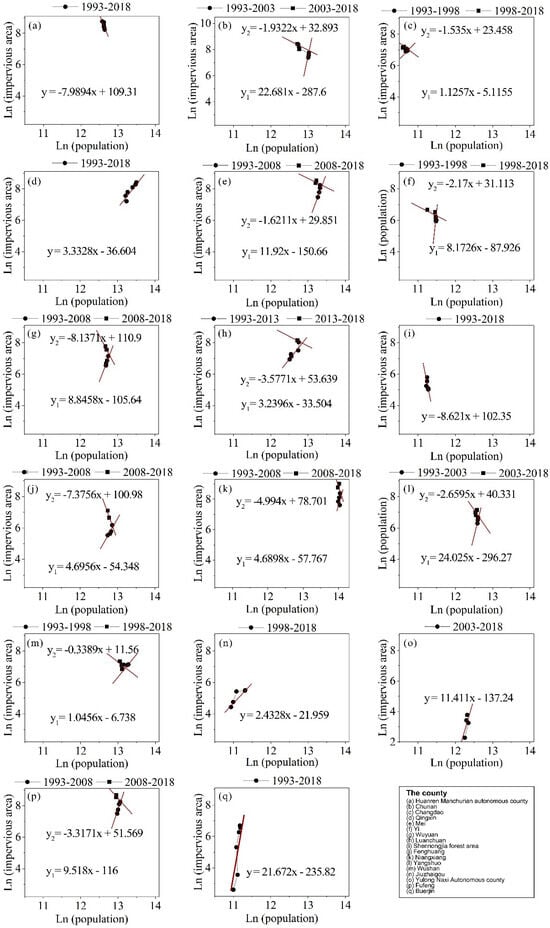 We further investigated the scaling relationship between impervious land expansion and resident population over time (Figure 3). There were three patterns. The first pattern was that the scaling exponent was negative (−7.99 in Huanren, Figure 3a; −8.62 in Shennongjia, Figure 3i), i.e., the resident population decreased, but the impervious land expanded. The second pattern was that the scaling exponent was positive first, and became negative in the late period, i.e., the resident population rose in the early stage and then flattened or decreased in the subsequent period, but the impervious land was continuously expanding. There were 11 counties in line with this trend, and the scaling exponents in the positive stage were all greater than 1.0. The last pattern was that the scaling exponent was positive across 1993 to 2018, i.e., the resident population increased, and the impervious land also expanded. A total of four counties conformed to this trend, with the scaling exponent being far greater than 1.0 (averaged at 9.71). All these three patterns indicated that the impervious land expanded much faster than the population growth. Most of the counties (13/17) were experiencing a shrinking population.