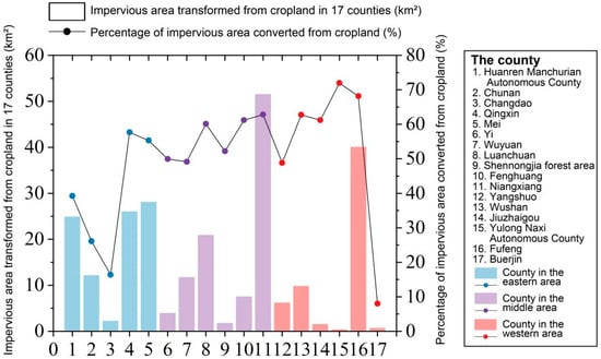 We also found that the impervious surface areas of 15 counties were mainly converted from cropland (Figure 4). The proportion converted from cropland in the 17 counties averaged at 50.1%. And the second-largest proportion was from the forest, with an averaged value of 8.9%. The conversion from a forest was especially largest for the eastern China counties, such as Chunan, Wuyuan and Fenghuang, at 34.1%, 23.0% and 16.7%, respectively. For Buerjin, which is located in northwestern China, the impervious land was converted mainly from grassland, and the proportion was 47.2%.