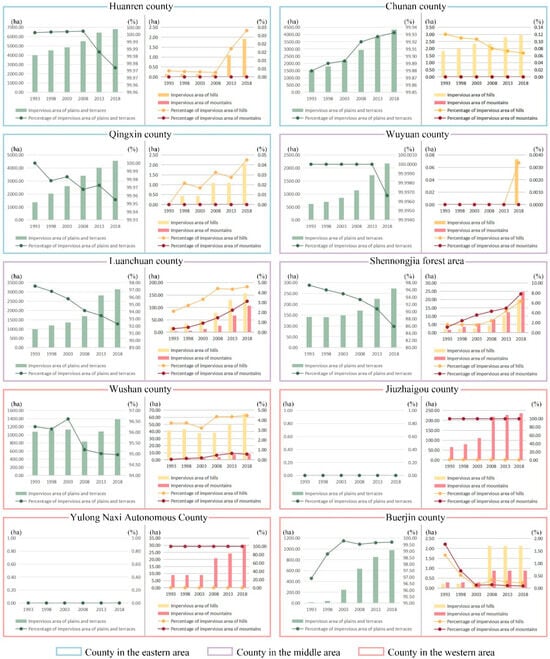 For the eastern China counties, impervious expansion mainly happened in the lowlands. Notably, in west China, the expansion tended to happen in the highlands. Some counties (Jiuzhaigou and Yulong) had 100% of their expansion in the highlands due to their geolocation. For the eight counties distributed in eastern, middle, and western China, impervious expansion in the highlands increased over time, although most expansion still occurred in the lowlands (Figure 5). For example, in the Luanchan county, the expansion in the highlands increased from 101.4 ha in 1993 to 491.0 ha in 2018, contributing to the increase in impervious area expansion from 9.9% to 14.2%, among which, the impervious expansion in hills increased from 81.9 ha (8.0%) to 287.9 ha (8.3%), while that in mountains grew from 19.5 ha (1.9%) to 203.1 ha (5.9%) during 1993–2018. For the Chunan county and Buerjin County, the expansion that happened in the highlands increased but the ratio was still decreasing, since the most expansion, by area and ratio, happened in the lowlands.
