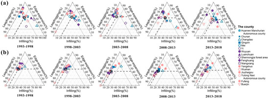 Land expansion types (i.e., infilling, edge-expansion, and leapfrogging) calculated from (a) the impervious area and (b) the numbers of patches in 17 counties.