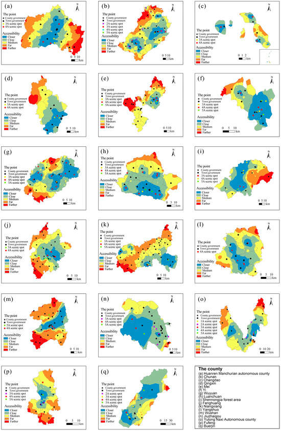 The accessibility levels of 17 counties located in different regions showed a trend of decreasing from the inside to the outside (Figure 7), with tourist attractions as the core. Almost half of the residents in the county had access to scenic spots in the “closer” and “close” ranges. For counties where the attractions were far apart, higher-level scenic spots also had higher accessibility.