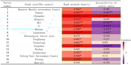 Correlation coefficients between annual area growth rate and road network density or accessibility to scenic spots in 17 counties. Note: * indicates significance: * p < 0.05, and ** p < 0.01.