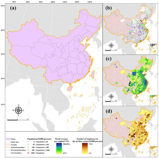 Study area. Notes: (a) indicates the location of the study area. (b–d) represent the population, fiscal revenue per capita, and the number of employees in the tertiary sector of the study area in 2021, respectively.