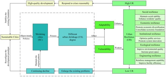 However, the differing research goals and focuses between studies on US, which look into the effects of urban depopulation and economic downturns, and those on UR, which examine cities’ responses to and recovery from shocks and disasters, have resulted in a lack of integration between these two areas. Although there have been notable advancements in research related to both US and UR [,,,,], one key limitation is that research on UR has not fully embraced the perspective of SCs, leading to several gaps in understanding resilient development in this context. First, the interaction and transmission mechanisms between US and UR have not been thoroughly explored [,]. Second, there is insufficient consideration of how economic and social factors affect UR in different SCs, resulting in a narrow analysis that fails to capture the complexities of these cities [,]. Third, existing studies have predominantly focused on the UR of individual SCs [], which restricts data coverage and limits the examination of interconnections across different spatial scales. Consequently, systematic research on UR in SCs is necessary to broaden and deepen understanding in this field. Building on the literature gaps mentioned above, future studies could explore the interaction and transmission mechanisms between US and UR, which have not been fully integrated in prior research. By considering multiple dimensions of UR, such research would provide a broader understanding of the factors that shape resilience in SCs. Additionally, it would go beyond the typical focus on individual cities by expanding the analysis to multiple cities, offering a more comprehensive view that includes spatial interconnections across different scales. These contributions would fill a critical void in the existing literature and provide a more nuanced understanding of UR in SCs.