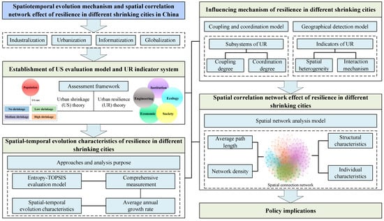 The contemporary global landscape is currently experiencing a profound transformation. The primary contradiction within Chinese society has shifted significantly, leading to increased uncertainties. US has become a phenomenon in numerous cities, intensifying the susceptibility, interactivity, proliferation, and hazardous nature of various risks and latent threats. Therefore, there is an urgent necessity to establish resilient cities to safeguard the new development paradigm of Chinese urban centers. Based on US and UR theories, we propose a methodological framework to explore the spatiotemporal evolution mechanism and spatial correlation network effect of resilience in different SCs in China (Figure 3). We developed a comprehensive UR assessment framework tailored to various types of SCs in China. In this framework, we established an evaluation model for US and a multidimensional indicator system for UR. We further explored the dynamic evolution of spatiotemporal UR patterns in diverse SCs and analyzed the influencing mechanism through a coupled coordination model and a geographical model. Finally, we employed a social network analysis model to illustrate the spatial relationships on UR under the impact of US, revealing the internal structure of UR networks and the spatial correlation network effect among them. By amalgamating insights from US and UR research, this study aims to provide a theoretical basis and practical guidance for establishing a more secure urban environment in China.