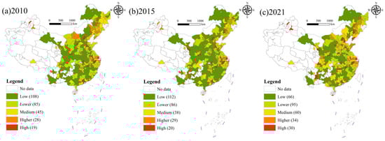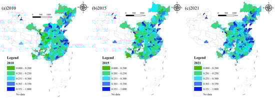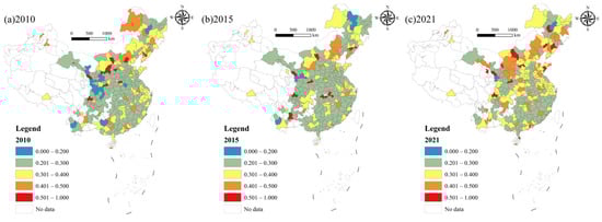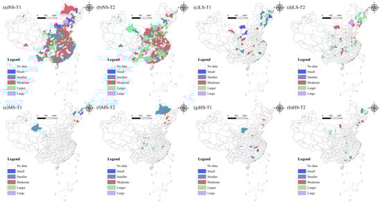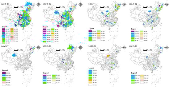 According to the coupling coordination model between the UR subsystems in Equations (13)–(15), the CD and CCD of 285 cities in China during 2010–2021 were obtained. We used the ArcGIS10.8 software to plot the spatial evolution of CD and CCD between UR subsystems in Chinese cities during 2010–2021 (Figure 7 and Figure 8). We also mapped the change of CCD type in different shrinking cities in the T1 and T2 time periods (Figure 9).
