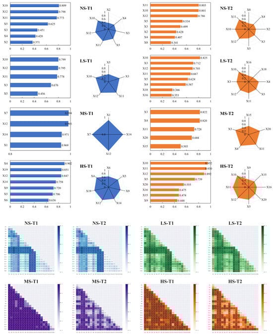 Characteristics of the spatiotemporal evolution of URC in 2010–2015 (T1) and 2015–2021 (T2) from the perspective of US. Notations: The division standards for different URC levels are Small difference (URC ≤ −0.057), Smaller difference (−0.057 < URC ≤ −0.007), Moderate difference (−0.007 < URC ≤ 0.023), Larger difference (0.023 < URC ≤ 0.060), and Large difference (URC > 0.060).
