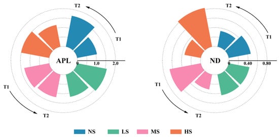 This study employed the average path length (APL) and network density (ND) metrics in the analysis of network structures to evaluate the overall UR correlation network of various shrinkage-type cities. The APL represents the average distance between any two nodes in the network, with a higher value indicating a longer distance required for event propagation between cities, resulting in lower transmission efficiency. Conversely, a lower APL signifies improved accessibility, operational efficiency, and robust propagation and diffusion effects within the network. The APL is calculated using the following formula: