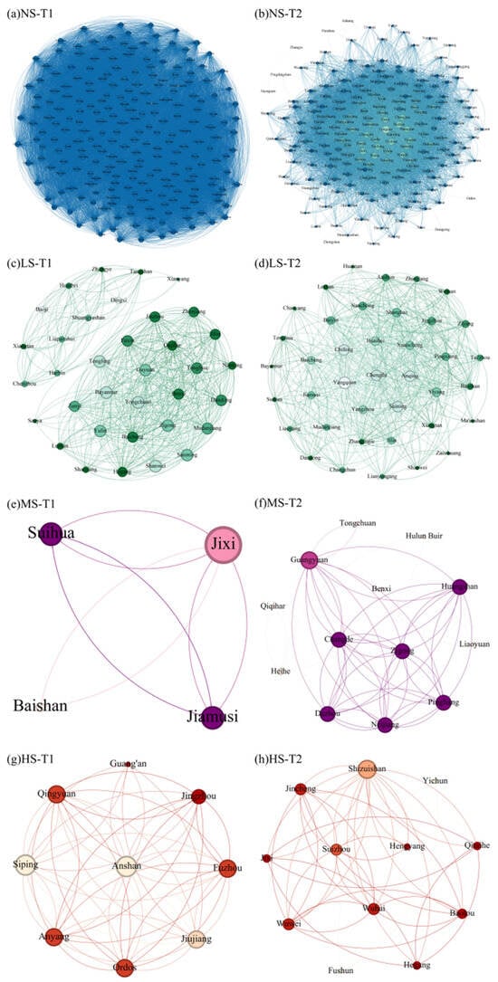 The study initially analyzed the geographical distribution characteristics of SCs (Figure 4). Between 2010 and 2015, a total of 54 cities exhibited notable US phenomena. The spatial distribution of these SCs reveals a predominant concentration in the northeast and northwest regions, with an overall mild degree of US. Conversely, resource-based cities such as Ordos and Anshan have experienced substantial population declines due to the gradual depletion of their resources. From 2015 to 2021, the number of SCs increased markedly to 76. This trend indicates that as urbanization in China advances and the economy develops rapidly, the phenomenon of US has intensified, particularly in the northeast, where both the number of SCs and the degree of US have exhibited the most pronounced growth.