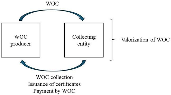 WCO could be understood as the oil used in cooking processes, such as frying, that could be produced by citizens, hotels, or restaurants [23]. As far as the collection of WCO is concerned, the companies responsible for oil collection emit certificates without charge for the collection and issuing services, paying, sometimes, a fee per liter of WCO [24]. This by-product presents valuable contributions, for example in polymer-based plastic production, since this consumes significant amounts of petroleum and WCO could present a valuable contribution, avoiding fossil fuel consumption [23]. WCO is significantly cheaper than other raw materials, for example in the Indian market. This “waste” could be around seven times cheaper than the closest priced virgin oil. In addition to the economic valorization, WCO has harmful consequences for ecosystems. As finalities, WCO could be applied at bio lubricant production [25] or being used in asphalt pavements to avoid cracks and improve mechanical properties [26]. Cheapness, local availability, and availability in big quantities are factors that attract people to consider this resource [27]. Figure 2 shows how the WCO recovery chain works.