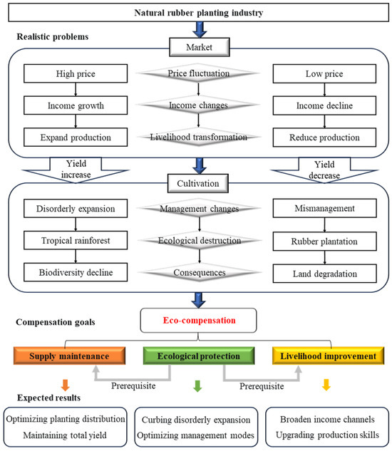 As the name suggests, the goals of eco-compensation always include ecological protection. But in addition, under certain conditions, eco-compensation may also have the potential to promote socio-economic development [48,50]. As mentioned earlier, NR is both an important industrial raw material and a source of livelihood for many agricultural households in tropical areas. Therefore, in the policy framework of this study, compensation goals should be diverse. They must balance ecology, production and livelihood.