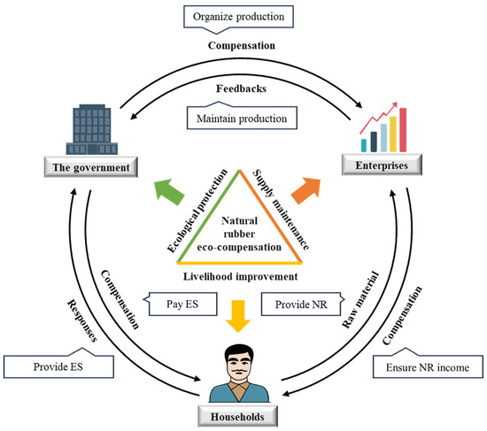 In addition, stakeholders are an inevitable topic in the study of eco-compensation [48,64,65]. Eco-compensation from an industry perspective may also involve more stakeholders, such as consumers and environmental protection organizations. The policy framework of this study aims to protect the ecology while maintaining the supply of NR and the normal operation of processing enterprises. From this point of view, the framework may help stabilize the price of NR products to a certain extent, with less impact on consumers. As for environmental protection organizations, they often play an important role in ecological protection [66]. For NR eco-compensation, environmental protection organizations could contribute to the process of raising funds and evaluating effectiveness.