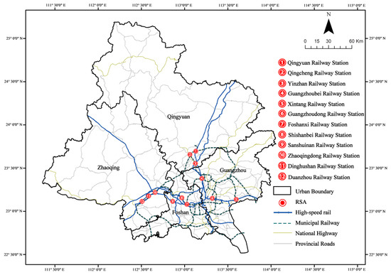 Guangzhou metropolitan area is an important part of the Guangdong–Hong Kong–Macao Greater Bay Area. The development plan is centered on Guangzhou City, with the core areas of Guangzhou City and Foshan City leading the way and the central urban areas of Zhaoqing City and Qingyuan City as the development poles. Relying on the major transportation corridors, the overall development pattern of the metropolitan area is constructed as “one core, two poles, and four axes”. There is the Beijing–Guangzhou High Speed Railway, Guiguang–Guangzhou High Speed Railway, Nan–Guangzhou High Speed Railway, Guangzhou–Foshan–Zhaoxing Intercity, Guangzhou–Qingyuan Intercity, and other rail transportation lines in the metropolitan area, and the transportation infrastructure is mature. Considering the factors such as opening time, line type, and completeness of data acquisition, this paper selects 12 railway station areas in the Guangzhou metropolitan area as the object of research and evaluation (Figure 1). The basic situation of each station area and the city where it is located is summarized in Table 1.