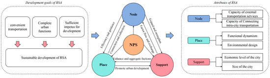 The continuous enhancement of the transportation node value and functional place value of the railway station area significantly promotes the smooth flow of resource elements within the metropolitan area; brings investment, people flow, and industrial agglomeration to the city, especially the booming development of modern service industry and advanced manufacturing industry; and strengthens the comprehensive competitiveness of the city and the metropolitan area [28,29]. In view of this, this study deeply recognizes that the level of sustainable development of railway station areas is not only affected by the value of transportation nodes and the value of urban places but also has a certain influential effect on the development of the city itself. Therefore, this study constructs an expanded three-dimensional assessment model of “transportation node–functional place–city support” (referred to as the NPS model). This new dimension of “city support” aims to explore the dynamic interaction between cities and railway station areas in a metropolitan area under different levels of development. As mentioned in previous studies, the three dimensions discussed in this study also interact with each other to promote the sustainable development of railway station areas. This is shown in Figure 2.