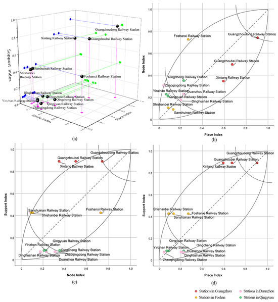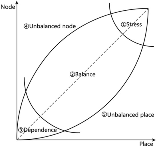The original NP model classification method is shown in Figure 3 and Table 4, which classifies stations into five categories: equilibrium, equilibrium pressure, equilibrium dependence, non-equilibrium nodes, and non-equilibrium places. In this study, the city support dimension is added, and the evaluation results are projected into the 3D model to obtain three different coordinate maps. This study categorizes sites into eight major categories, as shown in Table 5, which can be further subdivided according to the specific conditions of the studied objects.