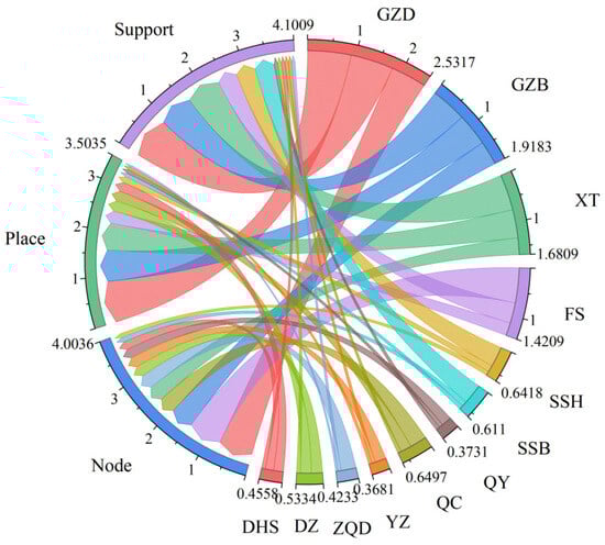Table 6 presents the weight allocation results for three dimensions and 16 constituent indicators. The weights of each variable under each dimension are relatively evenly distributed. Within the node dimension, both the station design scale (N1) and the number of interchangeable bus routes (N6) emerge as critical variables. The station platform design size serves as an indicator of the station’s significance and service capacity [38]. The count of interchangeable public transportation routes offers insights into the station’s accessibility and service scope within the city context, which, in turn, indirectly signifies the extent of development and economic vitality of the city’s public transportation network. The POI density is identified as the most pivotal indicator within the place dimension. In the city support dimension, the proportion of the tertiary industry emerges as the predominant determinant, aligning with previous findings that demonstrated a robust correlation between the development of a train station area and the proportion of the tertiary industry in the city landscape [39].