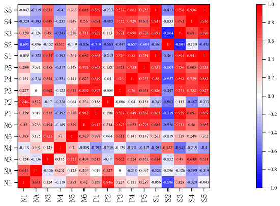 In addition to the discussion of the final results, the interplay between the evaluation indicators deserves further exploration. The normalized indicator data were subjected to a Pearson correlation coefficient test, and the outcomes are depicted in Figure 7. The analysis revealed a highly significant correlation among certain variables. Nonetheless, the pronounced correlation observed between these indicators does not pose a concern [41]. For example, there is a high correlation between the station size and the city’s economic development indicators, because the construction of the railroad station for the city where it is located not only provides convenient transportation conditions but also effectively drives the city’s economy, resulting in a “multiplier effect” [42]. Moreover, in the study, different indicators of each dimension will be given different weights and then used to calculate the final value of the sustainable development level.