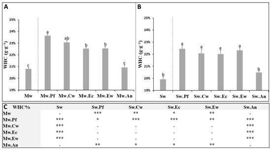 Figure 1. Water holding capacity of Mw (A) and Sw (B) amended or not with the different biochar types. Letters (a, b, c) refer to a significant difference between treatments at p < 0.05 (n = 5 ± SE). Significant difference between amended and unamended Mw and Sw is presented in (C) by * (p < 0.05), ** (p < 0.01) and *** (p < 0.001). Mw: unamended muddy waste; Sw: unamended sandy waste; Pf: palm fronds biochar, Cw: citrus wood biochar, Ec: eucalyptus chips biochar, Ew: eucalyptus wood biochar, and An: argan nut shells biochar.