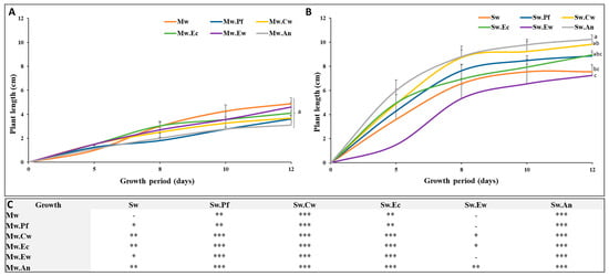 Figure 2. Stems height curves of Phaseolus vulgaris grown on Mw (A) and Sw (B) amended or not with the different biochar types. Letters (a, b, c) refer to a significant difference between treatments at p < 0.05 (n = 5 ± SE). Significant difference between amended and unamended Mw and Sw at Day (12) is presented in (C) by * (p < 0.05), ** (p < 0.01) and *** (p < 0.001). Mw: unamended muddy waste; Sw: unamended sandy waste; Pf: palm fronds biochar, Cw: citrus wood biochar, Ec: eucalyptus chips biochar, Ew: eucalyptus wood biochar, and An: argan nut shells biochar.