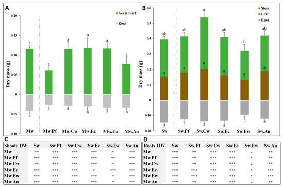 Figure 3. Dry masses of leaves, stems, and roots of Phaseolus vulgaris grown on Mw (A) and Sw (B) amended or not with the different biochar types. Letters (a, b refer to a significant difference between treatments at p < 0.05 (n = 5 ± SE). Significant differences between amended and unamended Mw and Sw at Day (12) are presented in (C,D) by * (p < 0.05), ** (p < 0.01) and *** (p < 0.001). Mw: unamended muddy waste; Sw: unamended sandy waste; Pf: palm fronds biochar, Cw: citrus wood biochar, Ec: eucalyptus chips biochar, Ew: eucalyptus wood biochar, and An: argan nut shells biochar.
