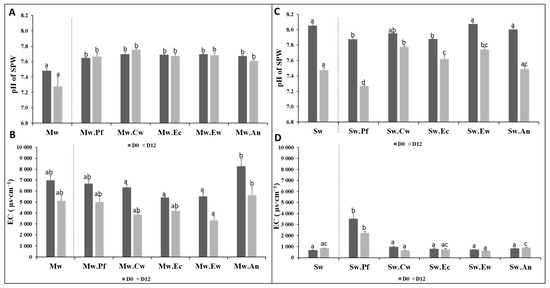 The pH and EC of soil pore water were investigated on two sampling days, D(0) and D(12), in both biochar-amended and unamended Mw and Sw. On D(0), the pH in the Mw and Sw was alkaline, with Mw recording a pH of 7.48 (Figure 4A), which was significantly lower compared to Sw at 8.05 (Figure 4C). By D(12), which corresponds to the harvesting day of P. vulgaris, the pH decreased to 7.28 in Mw and 7.47 in Sw. At the day of planting (D(0)), Mw amended with the various biochars resulted in a significant increase in pH compared to Mw alone. In contrast, the addition of Cw, Ew, and An biochars to Sw did not significantly alter pH in respect to Sw alone. In particular, Sw amended with Pf and Ec biochars reached a pH value of 7.88, which represents a significant decrease from the pH of unamended Sw.