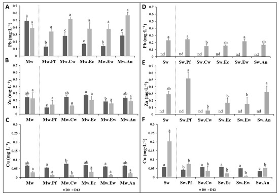 Figure 5. Soil pore water metals concentrations of Mw (AC) and Sw (DF), unamended and amended with the different biochar types, at two sampling days D(0) and D(12) − Pb in Mw (A) and Sw (D), Zn in Mw (B) and Sw (E), Cu in Mw (C) and Sw (F). Letters (a, b, c) refer to a significant difference between treatments at p < 0.05 (n = 5 ± SE). Significant difference between amended and unamended Mw and Sw at Day (12) are presented in Table S2 by * (p < 0.05), ** (p < 0.01) and *** (p < 0.001). Mw: unamended muddy waste; Sw: unamended sandy waste; Pf: palm fronds biochar, Cw: citrus wood biochar, Ec: eucalyptus chips biochar, Ew: eucalyptus wood biochar, and An: argan nut shells biochar. nd: refers to ‘not detected’.