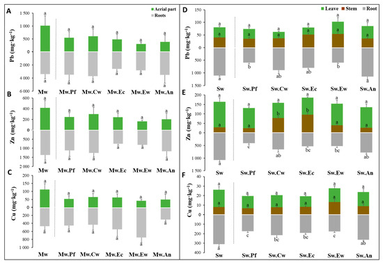 Figure 6. Pb (A,D), Zn (B,E), and Cu (C,F) accumulation in the shoots and roots of Phaseolus vulgaris grown on Mw (AC), and in the leaves, stems, and roots grown on Sw (DF), amended or unamended with the different biochar types. Letters (a, b, c) refer to a significant difference between treatments at p < 0.05 (n = 5 ± SE). Mw: unamended muddy waste; Sw: unamended sandy waste; Pf: palm fronds biochar, Cw: citrus wood biochar, Ec: eucalyptus chips biochar, Ew: eucalyptus wood biochar, and An: argan nut shells biochar.