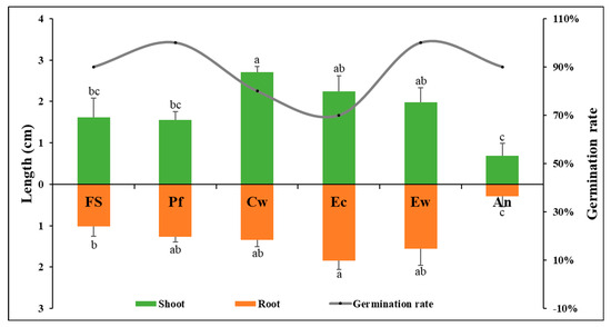 The standard germination tests and seedling length measurement in biochars (Figure 7), have been used to assess the effect of biochars on the germination and plant growth of Lepidium sativum seeds. The germination tests among different biochar types revealed that Pf and Ew biochars had a germination rate of 100%, which outperformed the control (FS) at 90%. Moreover, An biochar showed similar rate as the control, while Cw and Ec showed lower rates of 80% and 70%, respectively. However, these variations remain not clear and may be influenced by factors other than the biochar itself, such as the inherent germination abilities of the seeds. Notably, some treatments resulted in seeds with hard coats, indicating potential impermeability or mechanical resistance that could obstruct the diffusion of water and oxygen, leading to physical dormancy [96]. Given the presence of such factors, it is premature to draw definitive conclusions about the efficacy of the biochars solely based on germination rates.