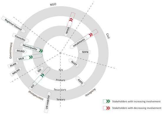 The dynamics of stakeholders changed according to their roles throughout the upgrading process. Initially, the key stakeholders were NHAG and SDFN, who conducted the settlement enumeration according to their contract with the Gobabis Municipality. At that time, and immediately afterwards, the community was more involved and made key decisions regarding upgrading and planning the re-blocked settlement, along with the town-planning students of NUST. The next phase proceeded as the Ministry of Urban and Rural Development (MURD) allocated funds for service installation and the inhabitants, along with NHAG and SDFN, provided physical labor to relocate themselves to their new plots and excavate trenches. Enumeration data were updated, the Social Tenure Domain Model (STDM) by the Global Land Tool Network (GLTN) was followed to register the data, and selected inhabitants were recruited to assist. The next steps included the participation of MLR and the municipality as primary stakeholders, which caused a shift in stakeholder involvement, as visualized in Figure 6. The stakeholders, such as the municipality, the MLR, and GIZ, although involved from the process initiation, increased their involvement during the implementation of the FLTS. They impacted the involvement of NHAG—and, therefore, as a cascading effect, the inhabitants—by leaving these stakeholders out of decision-making meetings [5]. The impact of this shifting relationship between stakeholders influenced the outputs of the inhabitants and especially women’s participation in the process.