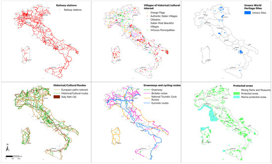 Despite the close relationship between sustainable transport and tourism and the well-established concept of accessibility in transport research [48], cycling as a sustainable means of transport to access destinations has received limited attention in scientific research [17]. Furthermore, existing studies on cycling accessibility mainly focus on access to workplaces and essential neighbourhood services such as parks, grocery stores, health facilities, and schools for local residents [49,50], while research on accessibility to tourist attractions by bicycle remains scarce [51]. The contribution of walking to sustainable mobility policies has also been little investigated by academia so far [52]. With regard to intermodality between cycle or pedestrian paths and the railway network, numerous studies focus on access to railway stations through soft mobility infrastructures, investigating above all the aspects that can influence intermodality between the two transport systems [53], while the use of the train for access to greenways, cycle paths, paths, and trails is still little studied. In this context, within the scope of this study, the result of a collaboration protocol signed in 2021 between Rete Ferroviaria Italiana (RFI—the Italian National Railway Company) and the Alliance for Soft Mobility (A.Mo.Do.) for the creation of the “Atlas of soft mobility in Italy”, a methodology has been defined to analyse the relationships between railway stations, the soft mobility network, and national historical, artistic, and naturalistic heritage (UNESCO sites, natural parks, historic villages). The aim is to develop a tool that, with a view to enhancing the internal areas of the Italian peninsula, supports decision makers in identifying railway stations that could constitute intermodal hubs for the connection, through infrastructures for soft mobility, of the historical, cultural, and environmental resources of the surrounding area, prioritizing where to concentrate public investments, by definition always limited.