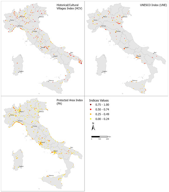 For scenario 2, experts were asked to pay particular attention, in the comparison process, to the development of active tourism in the inner peripheries. This request has, presumably, led to the attribution (Table 4) of a greater weight to the HCV Index than to the UNE Index (0.20 vs. 0.15): the UNESCO sites, in fact, already attract many tourists and, probably, experts have evaluated historical/cultural villages as more important for the development of more sustainable tourism in the inner peripheries.