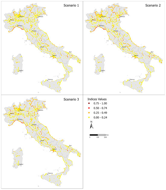 Only a limited number of stations have SMH scores above 0.50: 16 stations (0.6%) in scenario 1, 31 stations (1.2%) in scenario 2, and 33 stations (1.3%) in scenario 3 (Table 10). In all three scenarios, most stations with SMH scores greater than 0.50 are located in the northwest (68.9% in scenario 1, 61.3% in scenario 2, and 43.8% in scenario 3) (Figure 5). Among the regions with the highest percentages of stations with SMH above 0.50, there are Liguria (in all three scenarios); Piedmont (in scenarios 1 and 2); Lombardy, Basilicata, and Veneto (in scenarios 2 and 3); and Campania (only in scenario 3).