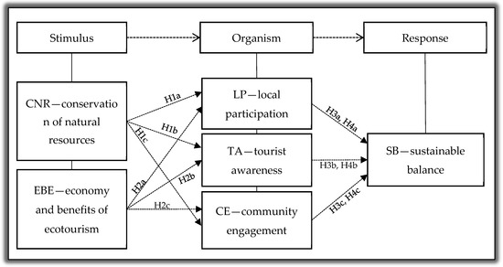 The SOR model provides a structured framework for connecting key themes from the literature review, enabling an analysis of the interrelationships between the economic, ecological, and social dimensions of ecotourism. The application of the SOR model (Stimulus-Organism-Response) allows for a deeper understanding of how stimuli, such as economic and ecological factors, shape the perceptions and behaviors of actors (organism) and lead to corresponding responses. The study by Ren et al. [34] emphasizes the role of ecotourism in fostering ecological behaviors among local residents. The authors identify key stimuli, such as ecosystem conservation, which positively influence community perceptions and highlight the importance of responsible behavior as a critical factor for achieving sustainability. Critically, their findings suggest the need for further analysis to better understand how social contexts shape ecological responses, which can be more comprehensively addressed through the SOR model. Based on theoretical insights, the following hypotheses are proposed: