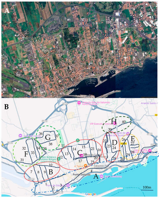 (A): The satellite image of the study area (Ponta Delgada); (B): spatial distribution of transects. (1–40) and their grouping: (A)—coastal built-up land, (B)—residential suburbs (80–90% of the surface is built-up) with an admixture of green areas and some agricultural lands, (C)–city center, densely-built-up (80–90%), with sparse tree vegetation, (D)—city center, densely built-up (70–80%), well timbered, (E)—residential suburbs (60–70%), with an admixture of urban greening space and some open tarred lands, (F)—residential suburbs, (50–60%), with an admixture of pastures and arable lands, (G)—residential suburbs, (50–60%), with an admixture of gardens, pastures and parkland, (H)—industry area (70–80%). Three transects in rural land (41, 42, and 43) were designed in Arrifes, further to the east (viz. Figure 2A).
