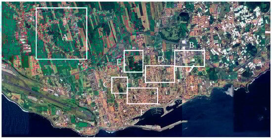 Different landforms in the urbanized landscape of Ponta Delgada: (A): rural land, (B): urban land, residential loosely built-up land, (C): urban greening space: Borges municipal garden; (D): urban land, city center; (E): urban greening space: Canto botanic garden; (F): coastal densely built-up land.