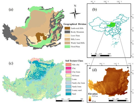 Map showing (a) the geographical divisions of the study area, (b) the location of the study area in China, (c) the soil texture classes of the study area, and (d) the elevation of the study area.
