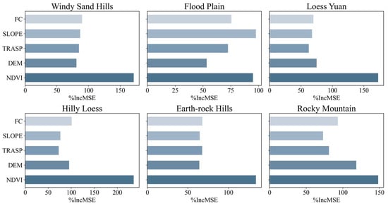 Considering that the effect of environmental variables on SM is closely related to the study period and area [76], and that the Loess Plateau has a large range, including a variety of terrain, soil, and vegetation types, the importance analysis of environmental factors based on geographical divisions could be set to a more regional characterized weight value by using RF’s variable importance measures (Table 1).